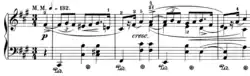 The second mazurka of the set, in C-sharp minor, is quite an outwardly dance-like piece, with a triple meter and bass line characteristic of a waltz. It starts with a slow introduction characterised by the play between the inner voices. The principal theme, returning a couple of times, although in slightly altered form, has a lyrical and almost melancholy character. The second theme makes use of the Lydian mode. The trio section provides a contrast with a more joyous theme. This then quickly fades into the opening introduction measures and the mazurka ends after the main theme is repeated twice. It lasts around two and a half minutes.[3]