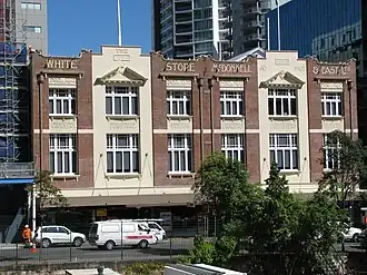 In 1911, McDonnell & East Ltd acquired the adjoining George Street allotments to the corner of Tank Street, and in October 1911 Brisbane architect Thomas Ramsay Hall called tenders for a new brick building. The contract was let to Andrew Gillespie with a price of £10,734, which included electrical fittings, counter, fixtures and passenger lift. Construction began in January 1912, and the new building, advertised as the White Store, was occupied in April 1913. The company continued to lease the original building.[1]