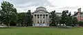 Though White's subsequent life was plagued by scandals, and McKim's by depression and the loss of his second wife, the firm continued to produce magnificent and varied work in New York and abroad.[9] They worked for the titans of industry, transportation and banking, designing not only classical buildings (the New York Herald Building, Morgan Library, Villard Houses, and Rhode Island State Capitol), but also planning factory towns (Echota, near Niagara Falls, New York; Roanoke Rapids, North Carolina; and Naugatuck, Connecticut),[10] and working on university campuses (the University of Virginia, Harvard, Adelphi University and Columbia). The magnificent Low Library (1897) at Columbia was similar to Thomas Jefferson's at the University of Virginia, where White added an academic building on the other side of the Lawn.