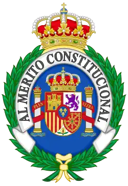 The Order of Constitutional Merit is a civil order of merit established by royal decree on 18 November 1988. The order is granted those who have carried out activities in service of the Spanish Constitution and its values and established principles. It may be granted to people and groups both public or private, Spanish or foreign. Recipients are treated as an Excellency.