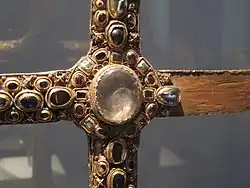 The jewelry of the Byzantine Empire often features religious images or motifs such as the cross, even in pieces that were for secular use. Elaborate Roman styles were continued, but with growing use of cloisonné enamel. The main commissions for gold work and jewelry came from the Court or the Church.[18] As such, much of the jewelry was very religious, involving ornate crosses and depictions of the afterlife or of saints' lives.[19] The Byzantines excelled in inlaying and their work was enormously opulent, involving precious stones, glass and gold.[20] Not much of Byzantine jewelry remains, as this period marked the end of burying a person's jewelry with them, so much of the truly extravagant jewelry – depicted in mosaics and paintings – has disappeared.[21] Carolingian jewelry is similar to Byzantine in that the modern world has lost almost all of it, except that which was created for religious purposes.[22] The Carolingians were similar to the barbarians in their love of color, but the techniques they used – especially enameling – are much more reminiscent of the Byzantines.[22] The most outstanding piece of jewelry that still remains from this period is the crown of Charlemagne, with precious stones, filigree, enamel and gold.[23] The Ottonian style is, again, very similar to the Byzantines and the Carolingians. Religion plays a main part in the jewelry that remains.[24] The Ottonian style characterizes a cross between German and Byzantine, superior in both technicality and delicacy.[24]