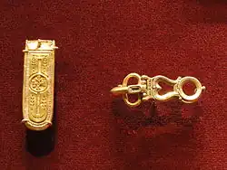 Filigree and granulation are two processes that are also closely related. They involve the decoration of a sheet of gold using the application of wires or grains of gold which can be worked into very intricate patterns.[36] These techniques allowed for intense detail and delicacy because the wires or grains could easily be worked into twisted patterns and minuscule facets.[37] All of these techniques enabled detailed work on gold jewelry, adding other materials or fine details.
