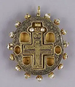 Additionally, wearing jewelry sold near pilgrimage sites or containing relics was a way to for those who have voyaged to display piety. Many times this looked like a pendant cross that contained a souvenir from their journey.[4] Pilgrims also took such souvenirs from these sites, usually oils or pieces of earth, in hopes that they would protect them on their journey back home and improve the quality of their prayers.[5] Typically, these pendants were hinged at the top and were worn around the neck as amulets. One example of this type of necklace being a reliquary cross from the Medieval Byzantine period from around 1100–1200 AD.[5]