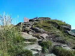 The summit plateau is traversed by a main path from the Tetřeví chata tourist intersection, marked with an informational board indicating an elevation of 1,165 m, to the Medvědí hora (Rysí skála) tourist stop, marked with an informational board indicating an elevation of 1,162 m.[3] The summit plateau is forested with spruce forest and covered with alpine grass. There is a secondary triangulation station on the summit plateau in the form of a benchmark, marked on geodetic maps with the number 22.3, at an elevation of 1,162.20 m and geographical coordinates 50°05′19.06″N 17°08′49.05″E / 50.0886278°N 17.1469583°E, located about 20 m northwest of the summit. On the summit, there is a rock group that serves as a limited viewpoint, offering restricted views towards Dlouhé stráně mountain. The State Administration of Land Surveying and Cadastre lists the highest point – the summit – at an elevation of 1,163.6 m with geographical coordinates 50°05′15.9″N 17°08′49.8″E / 50.087750°N 17.147167°E.[5][6]