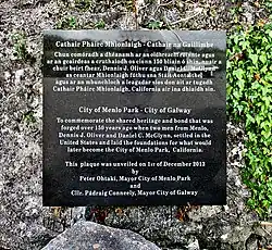 3. ^ "Menlo Park history". menlopark.org. City of Menlo Park. Retrieved 6 January 2021. The men named their new home after their old, in Menlough on Lough Corib, County Galway, Ireland