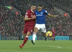 In the following season, Divock Origi scored one of the most memorable goals ever witnessed in a Merseyside derby. With the score goalless after 90 minutes, Virgil van Dijk volleyed a speculative effort towards goal which skewed off his boot and high into the air. Everton goalkeeper Jordan Pickford attempted to catch the ball but missed, as it came back down off the crossbar in front of the waiting Origi, who nodded in the winner in the sixth minute of added time.[59] The return game in March 2019 ended in a 0–0 draw at Goodison Park and saw Liverpool move down to second place, where they remained until the end of the season.[60]