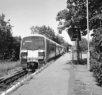 Merton Park station continued to serve the West Croydon to Wimbledon Line until its withdrawal from service after the last train on 31 May 1997 and conversion into a stop on the Wimbledon branch of the Tramlink network.[2] Merton Park tram stop now overlaps the site of the original station, the tram lines occupying the site of the trackbed and platform of the old West Croydon to Wimbledon Line.