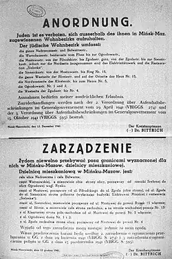 The Mińsk Mazowiecki Ghetto or the Mińsk Ghetto (Polish: Getto w Mińsku Mazowieckim, Yiddish: נאוואמינסק, Novominsk) was a World War II ghetto set up by Nazi Germany in occupied Poland. Some 7,000 Polish Jews were imprisoned there from all neighbouring settlements for the purpose of persecution and exploitation.[1][2] Two years later, beginning 21 August 1942 during the most deadly phase of the Holocaust in occupied Poland, they were rounded up – men, women and children – and deported to Treblinka extermination camp aboard Holocaust trains.[3] In the process of Ghetto liquidation, some 1,300 Jews were summarily executed by the SS in the streets of Mińsk Mazowiecki.[2]