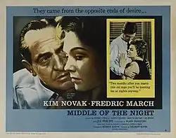 Middle of the Night is a 1959 American drama film directed by Delbert Mann[3][4] and starring Kim Novak and Fredric March. This story of a May-December romance was adapted by Paddy Chayefsky from his own 1954 teleplay and 1956 Broadway play, both of the same name. The film was entered into the 1959 Cannes Film Festival, where it competed for the Palme d'Or,[5] and was released by Columbia Pictures.