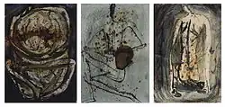 The subjectivity was disappearing gradually and more abstract pictures dealing with death and dying, the tragic life situations, appeared, namely in form of asphalt drawings and in the series of white pictures. The abstraction culminated in the series of pictures called The Heads where specific shapes encounter colourful abstraction, some pictures are inspired by natural mysticism and rituals dealing with the life cycle. The result is longing for the restoration of order reflected in the geometric figures. A series of pictures inspired by the Bible should be definitely mentioned in relation to her abstract art (Carpe Diem, 2009).