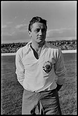 On the national level, Jovanović made his debut for Yugoslavia in a September 1947 Balkan Cup game against Albania and earned a total of 25 caps (no goals).[1] He was part of the Yugoslav squad at the 1948 Summer Olympics and the 1950 FIFA World Cup.[2] His final international was a November 1950 friendly match against Norway.[3]