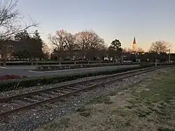 Misenheimer with Pfeiffer University buildings in the background, Norfolk Southern Railroad line in the foreground