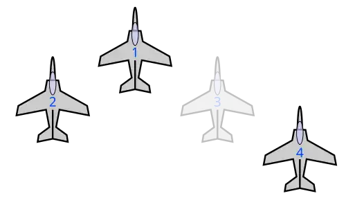 Several variants of the formation are seen. The formation most commonly used in the United States is based on the "finger-four" aircraft combat formation composed of two pairs of aircraft.[8] The aircraft fly in a V-shape with the flight leader at the point and their wingman on their left. The second element leader and his wingman fly on the right.[4] The formation flies over the ceremony low enough to be clearly seen and the second element leader abruptly pulls up out of the formation while the rest of the formation continues in level flight until all aircraft are out of sight.[4]