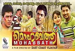 Mohabbath (transl. Love) is a 2011 Indian Malayalam-language romance film directed and produced by East Coast Vijayan. It was written by Siddique Shameer based on his novel Kalippavakal. The film stars Meera Jasmine, Munna and Anand Michael. The film features music by S. Balakrishnan, who makes his comeback through this film. Renowned singer Hariharan appears as himself in a song sequence while Roma does a cameo role.