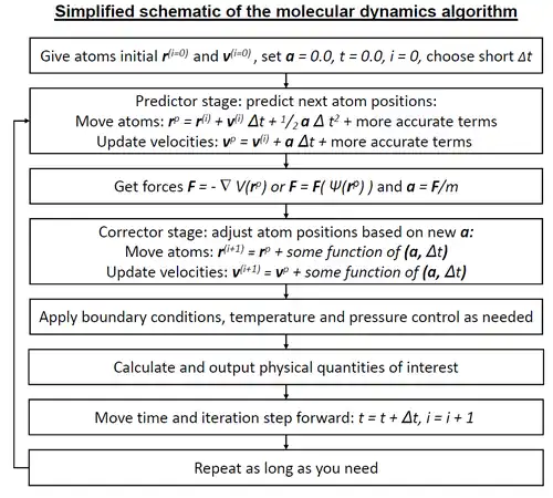 A simplified description of the standard molecular dynamics simulation algorithm, when a predictor-corrector-type integrator is used. The forces may come either from classical interatomic potentials (described mathematically as ) or quantum mechanical (described mathematically as ) methods. Large differences exist between different integrators; some do not have exactly the same highest-order terms as indicated in the flow chart, many also use higher-order time derivatives, and some use both the current and prior time step in variable-time step schemes.