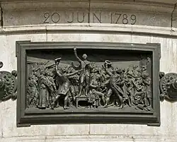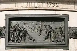 The stone pedestal is surrounded with twelve high reliefs in bronze, made by Léopold Morice.[2] Connected with rosettes and arranged at eye level, they constitute a chronology of events marking the history of the French Republic, between 1789 and 1880 :