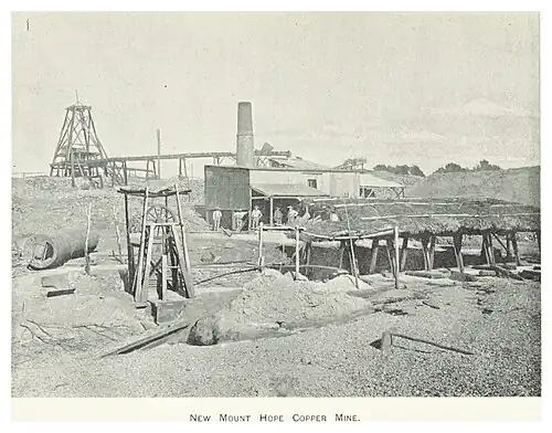 By 1883 the New Mount Hope mine was employing 200 men and boys and had produced 2,088 tons of ore to produce 431 tons of copper. A township of 800 people had grown up around the mine with four hotels, a billiard hall and boxing saloon, four stores, a post office and a bank.[5] This was a prosperous period for the New Mount Hope company; for several years dividends of 2s. 6d. per share were paid to shareholders.[20]