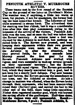 Obviously outgunned in the professional era, the club stepped back from senior football at the end of the 1893–94 season,[8] and in 1898–99 had its best run in the King Cup, getting to the semi-final - its tie against Edinburgh Celtic ending after 82 minutes, the Celtic players quitting the game with Rovers 10–0 up, "protesting against the capability of the referee"[9] - but conceded in the first minute in the semi-final at West Calder, and went down 9–0.[10]