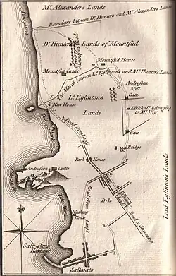 The small estate of Montfode was involved in the case of the murder of The 10th Earl of Eglinton by Mungo Campbell. John Brown, tide-officer or tide-waiter (a customs officer who boarded and inspected incoming ships) at Saltcoats, gave evidence that on the day of the earl's death, Tuesday 24 October 1769, he was on duty and walking with Mungo Campbell "They passed through the grounds of Montfodd, and thereafter crossed a burn, which is the march between Montfodd and the earl of Eglintoun's property, and went through lord Eglintoun's ground towards the sea."[8] Mungo had permission from Dr. Hunter to shoot on the lands of Montfode, as well as preserve game and prosecute poachers; however, he had no such permission from Lord Eglinton.[9] On this day they were hunting for woodcock in the glen of the Montfode Burn and after crossing the Montfode Burn they walked briefly through the Earl of Eglinton's property before reaching the beach.[10]