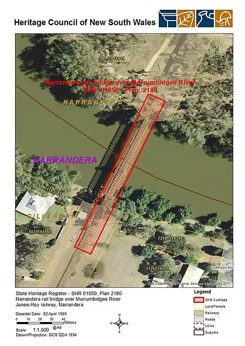 - ^ a b "Narrandera Rail Bridge, Narrandera, NSW, Australia (Place ID 16076)". Australian Heritage Database. Australian Government. 15 May 1990. Retrieved 29 April 2020.