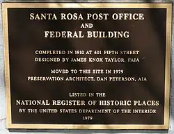 The Santa Rosa Main Post Office was eventually relocated to 2nd Street and following the 1969 earthquake that ravaged much of downtown Santa Rosa, the historic post office was slated to be razed to make way for a mall. Architect Dan Peterson led the campaign to save the post office by proposing that it be moved out of the path of urban renewal. Starting in April 1979, workmen raised the great structure and lay before it a bed of rails and a network of pulleys and cables. The building moved, but almost imperceptibly — an average of 36 feet a day.[3] The building was moved over 750 feet to its new home on 7th street, between A and B streets. Architect Dan Petersen restored it as a museum and placed the building onto the National Register of Historic Places. It reopened in 1985 as the Sonoma County Museum.