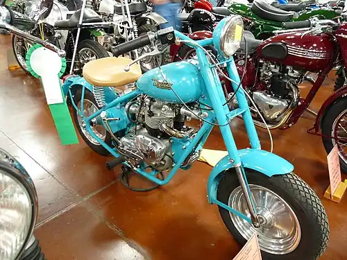 Prototypes built during the war used pre-war Villiers 191 cubic centimetres (11.7 cu in) "Double Century" engines. These were no longer available at the end of the war, so the Mustang Colt, the first production version of the Mustang motorcycle, used a 125 cubic centimetres (7.6 cu in) Villiers engine in a downsized frame with 8-inch (200 mm) wheels.[2][5] 235 Colts were made before the supply of Villiers engines began to dwindle.[2]
