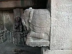 An early votive record from the time of the Tughluqs is dated Vikrama year 1394 (1323-24 CE) and records the homage paid by two brahamins named Mādhava and Keśava. It is engraved on the sculpture of an elephant just inside the entrance (see figures). Another important inscription, documenting the co-existence Hindu and Muslim religious activities at the site, mentions a festival (yātrā) of the god Udaleśvara in 1338, the same year as the Tughluq inscription recording the construction of the mosque in the temple precinct.[7] For the Tugluq inscription, see Tughluq Shāhī mosque, Udaypur, Madhya Pradesh. Udaleśvara is a local spelling of Udayeśvara, the main deity in the temple, named eponymously after the Paramāra king Udayāditya.[8]
