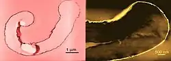 Electron microscope image of cotton fibers coated with gold (left) and palladium (right) nanoparticles. The nanoparticles make up just the outline of the fibers in these two images.[8]