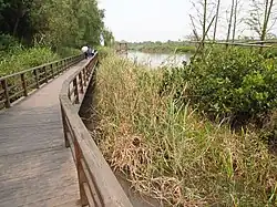 The tourist area of the park is located on an estuary on the west bank of the Pearl River.[3] The "Wetlands Singing at Night" is currently one of the city's Eight Sights. 141 known species of migrant birds visit the wetlands each year.[1] In the summer, water lilies cover the entire surface of the area.[1] In addition, fish, shrimp, and crabs live throughout the park, as do lotus, bananas, and sugarcane.[3] To avoid disturbing the birds, visitors by boat are limited to 150 per day.[4]