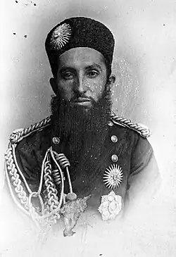 In 1895 the Emir Abdur Rahman Khan had intended to undertake a state visit to England to pay his respects to the ageing Queen Victoria. However, his health prevented him from making the trip, and so he instead sent his son the Shahzada Nasrullah Khan.[4] Nasrullah departed Bombay on 29 April 1895, with an entourage of over 90 dignitaries, including "five or six" high-ranking Afghan nobles and a group of priests for the observance of religious functions.[1] On 23 May the Shahzada landed at Portsmouth in England.[4]