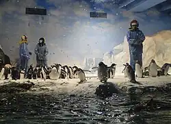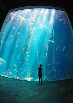 This exhibit hall features aquatic animals native to Taiwan, from waters as small as rivers to as vast as the open sea. The exhibits are themed after the water systems of Taiwan, starting from the river and the reservoir to the intertidal zone and finally to the open sea. There is also a touch pool featuring marine invertebrates in the intertidal exhibit area. Animals on display include tilapia, Japanese eel, trout, cuttlefish, nurse sharks, Indo-Pacific tarpon, yellowfin tuna, spotted eagle rays, and a whale shark.[7] The main ocean tanks contains 5,700,000 litres (1,500,000 US gal) of sea water, has a 16.5 m × 4.85 m (54.1 ft × 15.9 ft) acrylic viewing window and an 80-metre (260 ft) shark tunnel.[8]