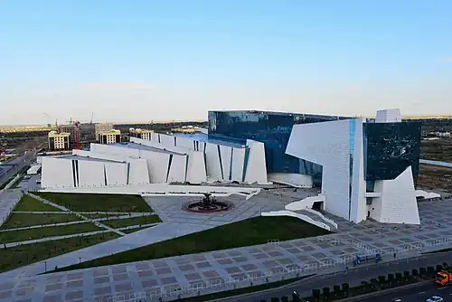 The National Museum of the Republic of Kazakhstan (Kazakh: Қазақстан Республикасының Ұлттық музейі, Qazaqstan Respýblıkasynyń Ulltyq mýzeıi), is located in Astana. When it was built in 2014, it was the largest museum in Central Asia. Made up of blue glass and white marble depicts Kazakhstan's history and culture from prehistoric times to the present. The priceless collection of the National Museum of the Republic of Kazakhstan is made up of numerous treasures that were made public as part of the governmental initiative "Cultural Heritage." The museum's structure draws attention thanks to its distinctive outside shape. According to the Decree of the Head of the State Darkhan Mynbay has been appointed the Director of the National Museum of Kazakhstan. [1]