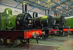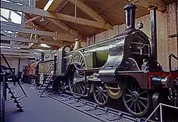 The smaller exhibits were housed in the old station buildings and the rolling stock and other large exhibits in the former locomotive erecting and repair shops of the old York and North Midland Railway (demolished after the museum closed).[39][40][41] Despite this however, the locomotives were displayed on short lengths of track acting as plinths, very much in traditional museum style. It was only when the NRM was formed that Britain acquired a rail-served railway museum where large exhibits could come and go with ease.