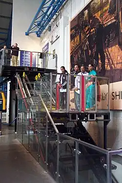 In order to provide step-free access from the main hall to the Workshop Gallery, the Museum Inclinator was constructed. Besides its primary function, this also served to demonstrate the workings of a funicular railway. To that end its workings were exposed in the style of a larger open air funicular railway, rather than being concealed in the fabric of the building as is more normal for intramural lifts.[73] It ceased working due to lack of spare parts, and with no plans for repair it was removed by August 2013.