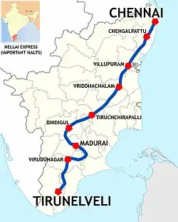 Nellai Express is a Superfast train operated by the Southern Railway zone of the Indian Railways. It runs on all days connecting Chennai Egmore with Tirunelveli Junction via Villupuram Junction, Tiruchirappalli Junction and Madurai Junction through the chord line.