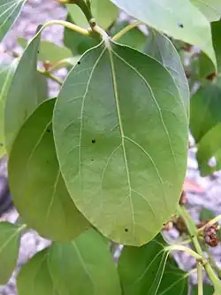 Leaves are pointed; ovate to elliptic in shape, 6 to 13 cm long, 2 to 6 cm wide. Glossy above and pale grey below. The leaf stem is green, between 12 and 20 mm long. Leaf veins are prominent, with three to five lateral veins. The basal pair of veins starts around 5 mm from the leaf base. And travels for about half the leaf length in a curve. Twigs are smooth, either brown or green.