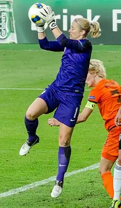 At the finals, the Dutch won the opening match against Ukraine, who also made their debut, 2–0.[2] Kirsten van de Ven was responsible for the first goal scored by the Dutch at any Finals. They then lost to hosts Finland 2–1, but a 2–1 win over Denmark helped them to second place and qualification for the knockout stage.[3][4] Here they met France, but since both teams did not score in 120 minutes it came to a penalty shoot-out. While only two of seven Dutch shooters failed to score, three French women fired at the post or over the goal.[5] In this way the Euro Championship newcomer surprisingly made it to the semifinals to face England. After a goalless first half, both scored between the 61st and 64th minute. It remained even until the end and the match went into extra-time. The English women scored the decisive goal four minutes before the end to win a place in the final.[6] In the final against Germany, England lost decisively 2–6. Vera Pauw initially remained in office, but was fired as bondcoach in March 2010 after differences with the association leadership. Her successor was first Ed Engelkes and then in November 2010 Roger Reijners.