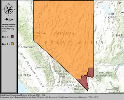 Table of United States congressional district boundary maps in the State of Nevada, presented chronologically.[3] All redistricting events that took place in Nevada between 1983 and 2013 are shown.