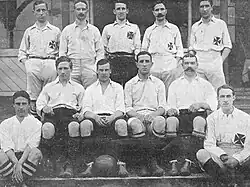 The club's official colours were all white,[8] with a cross pattée badge, although some photographs suggest black shorts and socks. The change kit was red shirts with white sleeves.[9]