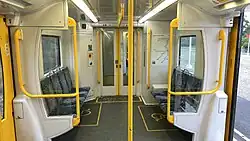 The design of the J sets is derived from the Transwa Prospector and AvonLink - the major difference being the driving cars are each single-engined instead of dual-engined, due to the lower top speed requirement for the Hunter line. Reversible seating is covered with durable, vandal proof woollen moquette fabric in 3x2 formation, and have retractable footrests. CCTV is installed. The cars have been fitted with Dellner SP couplers. They are able to absorb the impact of a collision, and the anti-climbers will also reduce the force of impact. They also have a different body design. Instead of the entire body being of the same design, such as the Tangara, the driver's cab is built as a protective cage, made of fibreglass, which stretches to the end of the guard's door. The stainless steel paneling starts at the guard's door. The guard's door is designed to operate separately from the passenger doors.