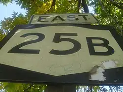 New York City did not have posted routes until mid-December 1934. Several routes that had ended at the eastern city line (the Queens–Nassau County border), such as NY 25, were extended westward at this time.[2] By the following year, NY 25B was assigned to the portion of Hillside Avenue between Braddock Avenue in Queens and Jericho Turnpike in Westbury, serving as a northerly alternate route of NY 25 between the two locations.[3] The alignment of the route has not been changed since that time.[1] The junction at the east end of the route was originally an at-grade intersection.[8] It was reconfigured into an interchange c. 1967.