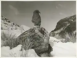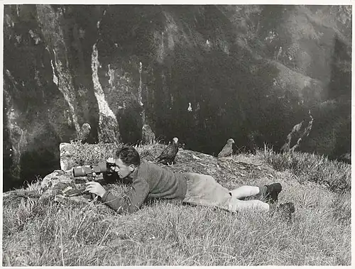 One of the expedition scientists photographed with kea by expedition photographer Kenneth Bigwood in March 1949