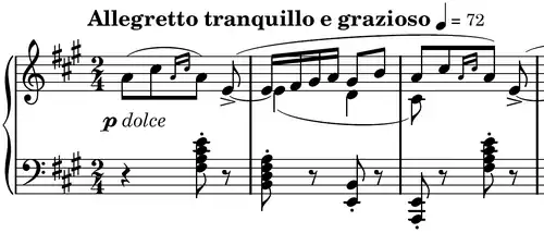 The Second, Third and Fourth piano sonatas are unrelated one-movement works. They were written during the period 1904–07 and published as the "Sonata-Triad", Op. 11. The first of the trio, in A, is an ecstatic work with attractive, lyrical themes, prefaced by a poem by Goethe.[14] The second, in D minor, is entitled "Sonate-Elegie". It opens slowly with one of Medtner's best-known themes and closes with an animated coda (Allegro molto doppio movimento, in D major) based on the second subject. The third, in C, returns to the lyricism of the first.