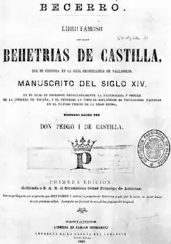 The name of the document of the lawsuit, printed in 1566, is Memorial contra las escrituras que el fiscal y valles presentan por autos de jurisdicción (English: "Memorial against the deeds filed by the prosecutor and valleys for writs of jurisdiction"). In it are contained documents of previous lawsuits against the same noble family, being one, for example, from 1398, prior to the "Old lawsuit";[30] another of the attached documents dates from 1351.[31] In 1910, the Jurisdiction of Cantabria published it under the title Memorial presentado al Rey por el Duque del Infantado en el pleito sostenido contra el Fiscal y los 7 valles de Villaescusa, Cayón, Penagos, Camargo, Cabezón, Alfoz de Lloredo y Piélagos. (English: "Memorial presented to the King by the Duke of Infantado in the lawsuit against the Prosecutor and the 7 valleys of Villaescusa, Cayón, Penagos, Camargo, Cabezón, Alfoz de Lloredo and Piélagos").[32]