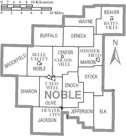 Noble County was formed on March 11, 1851, from portions of Guernsey, Morgan, Monroe and Washington counties.[6] It was the last and youngest county to be formed in the state.[7][8] It was named for either James Noble or Warren P. Noble, each of whom was an early settler in this region.[9]