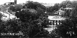 Normansville was originally called Upper Hollow; it was named for the deep ravine carved by the Normans Kill in which it was located. Further downstream was Lower Hollow, later named Kenwood. Upper Hollow had its start in 1805 with the construction of the Delaware Turnpike, which ran from Albany to Otego (which then was part of Delaware County).[1] The turnpike was carried over the Normans Kill (kill is the middle Dutch word for "stream") by a 100-foot-long (30 m) wooden bridge. Northwest of this bridge was a toll gate. The wood bridge was washed away by a freshet in 1869[2] (one year after the turnpike company had abandoned the turnpike) and the town of Bethlehem built an iron bridge in its place.[1][2]
