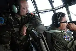 A North Carolina National Guard C-130 pilot talks to a Moldovan Officer during a medical evacuation check ride over North Carolina to learn medical evacuation techniques.