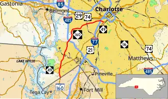 North Carolina Highway 160 (NC 160) is a primary state highway in the U.S. state of North Carolina. The highway runs north–south, connecting the Steele Creek neighborhood of Charlotte, Charlotte Douglas International Airport, and Uptown Charlotte.