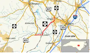 NC 217 is a two-lane rural highway that serves as a back-door road between Erwin and Fayetteville, connecting the town of Linden. In Erwin, it has a concurrency with NC 82.[1] Also in Erwin, the highway is concurrent with North Carolina Bicycle Route 5 from the southern NC 82 intersection to J Street.[2]