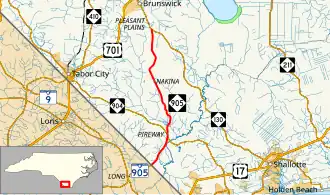 NC 905 is a two-lane rural highway that begins at the South Carolina line and South Carolina Highway 905 (SC 905) in Olyphic. Traveling north, it connects with NC 904 in Pireway. After its six-tenths-mile (0.97 km) concurrency with NC 904, it continues solo for 15.1 miles (24.3 km), connecting the communities of Bug Hill and Nakina, until it ends at NC 130 in Pleasant Plains.[1]